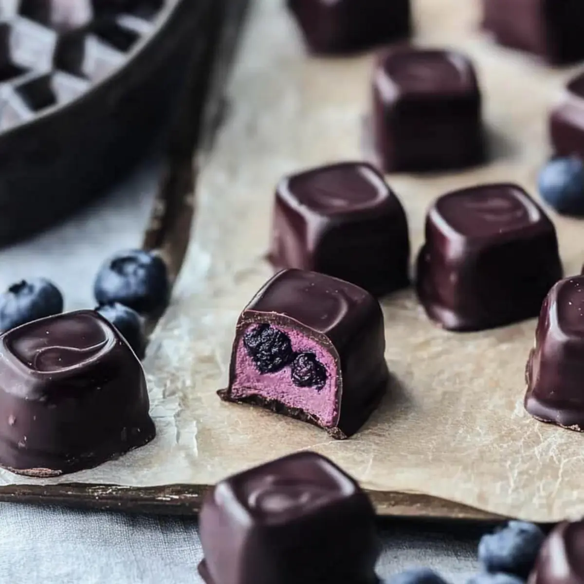 Jump to Recipe Print RecipeAs I sat down on my porch, a soft breeze accompanied by the sweet scent of blooming flowers reminded me that spring was just around the corner. Enter these delightful Blueberry Buttercream Chocolates, a no-bake dessert that’s perfect for celebrating the season or surprising family and friends. With an airy, creamy center and a luxurious dark chocolate shell, these chocolates are not only an impressive treat, but they’re also a breeze to whip up in your kitchen. Imagine the joy of gifting a little box of these beauties for occasions like Easter or Mother’s Day! They’re not just a stunning treat; they’re also an incredible way to embrace the vibrant flavors of fresh blueberries. Shall we dive into the delightful world of chocolate-making? Why are Blueberry Buttercream Chocolates irresistible? Decadent Chocolate Coating: Each chocolate is enveloped in a luxurious dark chocolate shell, elevating the dessert experience to new heights. Vibrant Blueberry Flavor: The addition of blueberry flavor paste creates a fruity explosion that balances beautifully with rich chocolate. No Bake Convenience: Making these chocolates is easy with no baking required, making them perfect for quick, impressive treats. Versatile Treats: Customize with different chocolate coatings or flavor variations for endless possibilities! Perfect for Celebrations: Whether for Easter, Mother’s Day, or simply as an afternoon delight paired with tea, these chocolates impress every time. Make-Ahead Friendly: Prepare them in advance and store them for up to two weeks—great for busy schedules! You’ll love sharing them in cute boxes or enjoying them as a sweet reward after a long day. Blueberry Buttercream Chocolates Ingredients For the Buttercream • Powdered Sugar – Adds sweetness and structure; a sugar substitute can be used for a lower-calorie option. • Unsalted Butter – Provides creaminess and depth of flavor; ensure it’s softened for easy mixing. • Blueberry Flavor Paste – Delivers authentic blueberry taste without an artificial aftertaste; natural blueberry extract can be a substitute. • Whole Milk – Adjusts the buttercream’s consistency for easy piping; use almond or soy milk for a non-dairy alternative. • Salt – Enhances overall flavor and balances sweetness. For the Coating • Dark Chocolate Coverture – Creates a smooth, crisp outer shell; choose high-quality chocolate for the best results. Embrace the art of making these Blueberry Buttercream Chocolates, and delight in the exquisite combination of flavors and textures they bring to any occasion! Step‑by‑Step Instructions for Blueberry Buttercream Chocolates Step 1: Prepare Your Pan Begin by preparing an 8 x 6 inch quarter sheet pan. Line it with parchment paper for easy removal later. Ensure the paper is flat against the bottom and sides to create a clean surface for your Blueberry Buttercream Chocolates. Prepping the pan is crucial for the buttercream to hold its shape as it firms up. Step 2: Cream the Butter In a large mixing bowl, use an electric mixer to beat the softened unsalted butter until it’s smooth and creamy—this should take about 3 to 5 minutes at medium speed. Watch for the butter to turn pale and fluffy, which creates an airy texture that will elevate your blueberry buttercream. This step is essential for achieving that delightful mouthfeel. Step 3: Incorporate the Sugar Gradually add the powdered sugar to the creamed butter, mixing well on low speed until it’s fully incorporated. This may take about 3 minutes. You want the mixture to become thick and fluffy; if necessary, stop to scrape down the sides of the bowl to ensure even mixing. This foundational step sets the sweetness and structure for your Blueberry Buttercream Chocolates. Step 4: Flavor the Buttercream With the mixer on low, mix in the blueberry flavor paste and a pinch of salt. Beat until the mixture is evenly combined, which should take about 1 to 2 minutes. The paste will infuse a vibrant blueberry flavor throughout the buttercream, balancing perfectly with the sweetness. The color should brighten, hinting at the delicious fruitiness to come. Step 5: Adjust the Consistency Start adding whole milk, one tablespoon at a time, mixing after each addition until a smooth, pipeable consistency is achieved. This may take around 2 to 3 tablespoons. If the buttercream feels too thick, incorporate a bit more milk; however, if it’s too soft, sprinkle in extra powdered sugar to thicken. The goal is a creamy, workable buttercream ready for shaping. Step 6: Chill the Buttercream Once your buttercream reaches the desired texture, cover the bowl with plastic wrap and chill it in the refrigerator for 15 to 20 minutes. This cooling period allows the buttercream to firm up, making it easier to cut into squares later for your Blueberry Buttercream Chocolates. It should feel set but still pliable after chilling. Step 7: Shape the Buttercream After chilling, scoop the buttercream onto a clean surface and flatten it to about an inch thick. Use a knife to cut the mixture into 1 x 1 inch squares. Place the shaped squares onto the prepared tray, allowing them to dry at room temperature for 12 to 24 hours. This step helps the filling hold its shape when coated with chocolate. Step 8: Melt the Chocolate In a heatproof bowl, melt the dark chocolate coverture using a double boiler or microwave in 30-second intervals, stirring until fully melted and smooth. Make sure it reaches around 115°F to avoid burning. A glossy finish will indicate it’s ready for dipping, ensuring your Blueberry Buttercream Chocolates have that professional touch. Step 9: Dip the Squares Using a fork or dipping tool, coat each buttercream square in the melted dark chocolate, ensuring it’s fully covered. Allow any excess chocolate to drip off before placing the dipped chocolates back on the parchment-lined tray. This dipping process should be done swiftly to maintain th