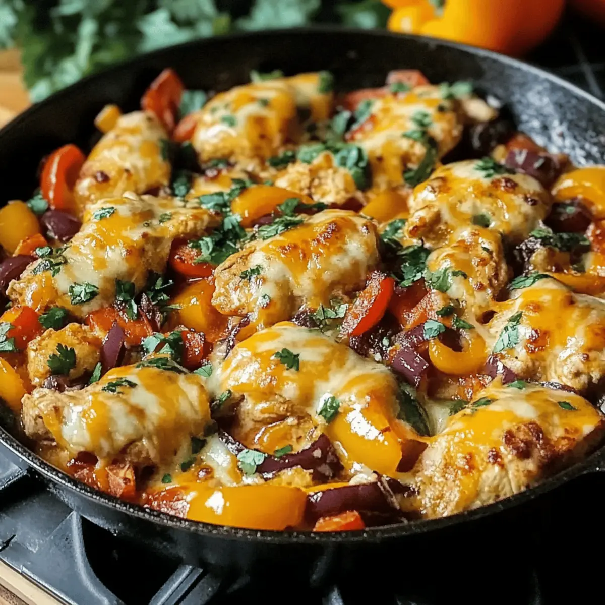 Jump to Recipe Print RecipeThe aroma of sizzling spices wafts through my kitchen, instantly transforming the atmosphere—like a warm hug on a busy weeknight. If you’re looking for a quick and satisfying dinner, my Cheesy Baja Chicken & Bell Pepper Skillet is a recipe you’ll want to keep in your back pocket. This delightful one-pan meal not only saves time on cleanup but also delivers a comforting blend of tender chicken, sweet bell peppers, and gooey melted cheese that will impress your family and friends alike. With minimal ingredients and maximum flavor, this dish is ideal for those who crave homemade comfort food without the fuss. What’s your favorite quick-cooking recipe that always hits the spot? Why Will You Love This Dish? Quick and Convenient: This dish is a one-pan wonder, saving you time on both cooking and cleanup, making it perfect for busy weeknights! Flavor Explosion: Each bite is infused with zesty spices and the natural sweetness of bell peppers, creating a delicious balance that will tantalize your taste buds. Crowd-Pleaser: Whether for family dinners or entertaining friends, this Cheesy Baja Chicken & Bell Pepper Skillet is sure to impress everyone at the table. Versatile Options: Feel free to customize it by swapping chicken for shrimp or adding black beans for extra protein—great for picky eaters! Savor the Comfort: The gooey melted cheese adds a rich creaminess that makes this dish feel just like a warm hug, perfect when you need comfort food. Pair it with easy sides like tortillas or a fresh salad to complete the meal. Cooking has never been this enjoyable! Cheesy Baja Chicken & Bell Pepper Skillet Ingredients For the Skillet Boneless, Skinless Chicken Breasts – Main protein source, providing structure and heartiness; can substitute with diced turkey breast for a leaner option. Olive Oil – Cooking fat for sautéing, adding richness; feel free to use avocado oil for a higher smoke point. Chili Powder – Adds heat and depth of flavor; swap with paprika for a milder taste if desired. Cumin – Brings warmth and earthiness; no substitutions necessary for the intended flavor. Paprika – Adds sweetness and a hint of smokiness; smoked paprika can enhance depth if you prefer. Salt and Pepper – Season to taste, enhancing overall flavor; adjust according to preference. For the Vegetables Red, Yellow, and Green Bell Peppers – They provide sweetness, color, and nutrition; any color bell pepper or other vegetables like zucchini could work in this Cheesy Baja Chicken & Bell Pepper Skillet. Corn (Fresh or Frozen) – Offers a sweet, crunchy texture; canned corn or black beans can be used for different flavor profiles. Diced Tomatoes – Provides moisture and acidity to balance flavors; using canned tomatoes is an easy alternative. For the Topping Shredded Cheddar Cheese – Adds creaminess and richness when melted; Monterey Jack or Pepper Jack will bring a spicy twist if you fancy. Sour Cream (optional) – For serving, it adds creaminess and tang; feel free to substitute with Greek yogurt if preferred. Fresh Cilantro (optional for garnish) – Offers a fresh herbal note for garnish; parsley can work as a milder alternative. Step‑by‑Step Instructions for Cheesy Baja Chicken & Bell Pepper Skillet Step 1: Prepare the Chicken Begin by cutting boneless, skinless chicken breasts into bite-sized pieces and season them generously with chili powder, cumin, paprika, salt, and pepper. This will infuse the chicken with bold flavors. Set aside for about 5 minutes to let the spices meld while you prepare your skillet. Step 2: Heat the Skillet In a large skillet, heat two tablespoons of olive oil over medium-high heat until shimmering, which should take about 2-3 minutes. Make sure the pan is hot enough for searing to achieve a nice browning on your chicken, adding visual appeal and richness to your Cheesy Baja Chicken & Bell Pepper Skillet. Step 3: Cook the Chicken Carefully add the seasoned chicken to the hot skillet. Cook for 5-7 minutes, stirring occasionally, until the chicken is golden brown and cooked through—there should be no pink inside. The aroma should be delightful at this stage! Once done, transfer the chicken to a plate temporarily while you move on to the next step. Step 4: Sauté the Bell Peppers In the same skillet, add sliced red, yellow, and green bell peppers. Sauté for about 5 minutes, stirring frequently, until they soften and begin to caramelize slightly. The vibrant colors will brighten the dish and add a sweet crunch, enhancing your Cheesy Baja Chicken & Bell Pepper Skillet. Step 5: Add Corn and Tomatoes Stir in fresh or frozen corn and diced tomatoes to the skillet. Cook for an additional 3-5 minutes, allowing the mixture to bubble gently. This combination will meld the flavors together, making the filling vibrant and delicious as you prepare to reunite it with the chicken. Step 6: Melt the Cheese Reduce the heat to low and sprinkle a generous amount of shredded cheddar cheese over the mixture in the skillet. Cover with a lid and let it sit for about 2-3 minutes or until the cheese is melted and gooey, filling your kitchen with an irresistible aroma. This step adds the creamy comfort that makes the Cheesy Baja Chicken & Bell Pepper Skillet so appealing. Step 7: Garnish and Serve Remove the skillet from the heat and garnish your dish with freshly chopped cilantro for a burst of herbal freshness. If desired, serve with a dollop of sour cream or Greek yogurt on the side for added creaminess. This flavorful, one-pan meal is ready to delight your family and friends! Cheesy Baja Chicken & Bell Pepper Skillet Variations Feel free to have fun and make this dish your own—each variation adds a delicious twist to the original recipe! Protein Swap: Replace chicken with shrimp or tofu for a delightful alternative. Both options will soak up those vibrant spices beautifully. Veggie Boost: Add black beans or kidney beans for extra protein and fiber, turnin