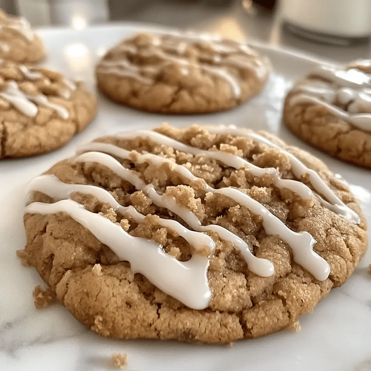 Jump to Recipe Print RecipeAs I sifted through flour and sugar, the aroma of cinnamon wafted through my kitchen, whisking me straight back to the quaint coffee shops of Stars Hollow. These Delectable Gilmore Girls Coffee Cake Cookies promise a comforting taste of nostalgia with every bite. Not only are they an easy baking project perfect for any skill level, but they also make for an irresistible dessert that’s sure to impress at your Thanksgiving gathering. The soft, cake-like texture melds beautifully with the crunchy streusel topping, and the final drizzle of icing adds an enchanting touch. Who wouldn’t want to recreate a bit of Lorelai and Rory’s iconic charm at home? Are you ready to bake up some sweet memories? Why Are These Cookies a Must-Bake? Comforting nostalgia: Experience the heartwarming flavors of Gilmore Girls in every bite. Easy baking: Perfect for beginners, this recipe simplifies the cookie-making process without sacrificing taste. Versatile enjoyment: Serve these cookies warm with coffee or as a stunning centerpiece for festive gatherings. Flavor explosion: The blend of coffee, cinnamon, and crumbly streusel offers a delightful twist on traditional cookies. Time-saving delight: Bake in just 10-12 minutes for a quick treat that’ll satisfy any craving. Don’t forget to check out my recipe for Buttermilk Pancakes to complement your cozy baking days! Gilmore Girls Coffee Cake Ingredients For the Cookie Base Softened Butter (1/2 cup) – Provides richness and moisture; can be substituted with margarine if needed. Vegetable Oil (1/2 cup) – Enhances cookie softness; for a healthier twist, use olive oil. Brown Sugar (1 cup) – Adds moisture and a deep caramel flavor; light brown sugar is an acceptable substitute. Egg (1) – Binds all ingredients together; for a vegan alternative, use 1/4 cup applesauce. Vanilla Extract (1 tsp) – Offers a rich depth of flavor; almond extract can be a delightful substitute. Cinnamon (2 tsp) – Brings warmth and spice, crucial for that coffee cake essence; nutmeg can be swapped in a pinch. Baking Soda (1/2 tsp) & Baking Powder (1/2 tsp) – These leavening agents ensure cookies rise; freshness is key for best results. Salt (1/2 tsp) – Balances sweetness and enhances all flavors. All-Purpose Flour (2 1/2 cups or 325 grams) – Acts as the cookie base; for a gluten-free option, use a 1:1 gluten-free flour blend. For the Streusel Topping Softened Butter (1/4 cup) – Creates the crumbly streusel texture. Brown Sugar (1/4 cup) – Adds sweetness and enhances flavor depth in the streusel. Flour (1/3 to 1/2 cup) – Binds the streusel mixture; adjust for desired crumb texture. Cinnamon (1/2 tsp) – Elevates flavor in the streusel, giving it that cozy touch. Pinch of Salt – Balances the sweetness of the streusel topping. For the Icing Powdered Sugar (1/2 cup) – Sweetens and thickens the icing for a beautiful drizzle. Milk (1 tbsp) – Thin the icing for a perfect drizzle; for richness, use cream instead. Vanilla Extract (splash) – Enhances the icing’s flavor for a delightful finish. Now you’re ready to go on a comforting baking adventure with these fantastic Gilmore Girls Coffee Cake ingredients! Step‑by‑Step Instructions for Delectable Gilmore Girls Coffee Cake Cookies Step 1: Preheat the Oven Begin by preheating your oven to 350°F (175°C). This step is crucial as it ensures that your Delectable Gilmore Girls Coffee Cake Cookies bake evenly and develop that perfect golden color. While the oven warms up, gather all your ingredients and set a baking sheet lined with parchment paper nearby for easy access. Step 2: Cream the Butter and Sugar In a large mixing bowl, combine 1/2 cup of softened butter, 1/2 cup of vegetable oil, and 1 cup of brown sugar. Using an electric mixer, beat the mixture on medium speed until it’s light and fluffy, about 2-3 minutes. This step incorporates air into the batter, giving your cookies a delightful texture. Step 3: Incorporate Wet Ingredients Next, add in 1 egg and 1 teaspoon of vanilla extract to the creamed mixture. Mix on low speed until fully incorporated, approximately 30 seconds. The mixture should look smooth and creamy, free of lumps. This rich base is essential for achieving the comforting flavors of your Gilmore Girls Coffee Cake Cookies. Step 4: Mix in Dry Ingredients Gradually add 2 teaspoons of cinnamon, 1/2 teaspoon of baking soda, 1/2 teaspoon of baking powder, and 1/2 teaspoon of salt. Stir the ingredients slowly into the wet mixture using a spatula or wooden spoon until just combined. Avoid overmixing, as you want to maintain the fluffiness of the batter without developing gluten. Step 5: Add the Flour Slowly incorporate 2 1/2 cups of all-purpose flour into your mixture. Fold the flour until the cookie dough comes together, ensuring no dry flour remains but stopping before it becomes tough. The dough should be soft and slightly sticky, perfect for forming the cookies. Step 6: Prepare the Streusel In a separate bowl, mix 1/4 cup of softened butter, 1/4 cup of brown sugar, 1/3 to 1/2 cup of flour, 1/2 teaspoon of cinnamon, and a pinch of salt. Use your fingers or a pastry cutter to blend the ingredients until the mixture resembles coarse crumbs. Set the streusel aside; this will add a delightful crunch to your cookies. Step 7: Scoop and Shape the Dough Using a cookie scoop or tablespoon, portion out the cookie dough onto your lined baking sheets, leaving space between each cookie. Create a small indent in the center of each dough ball with your thumb. This well will hold the tasty streusel topping later, ensuring that every bite is a delightful experience. Step 8: Fill with Streusel Spoon the prepared streusel mixture into the indents of each cookie dough ball. Make sure to generously fill the centers, allowing for an extra layer of texture and flavor. The streusel will bake beautifully, forming a crunchy topping that perfectly complements the soft cookie. Step 9: Bake the