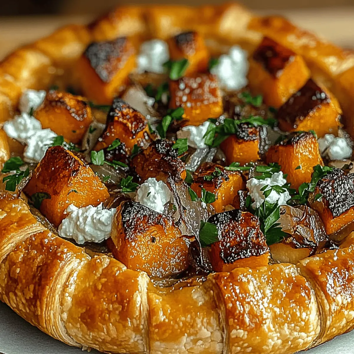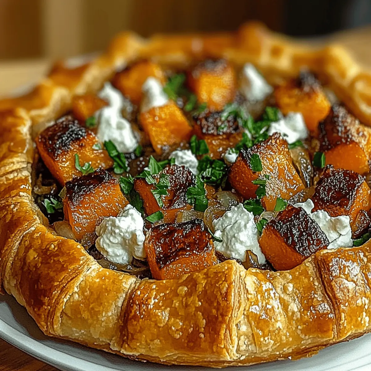 Jump to Recipe Print RecipeAs the leaves begin to turn and the air carries a crisp hint of autumn, the kitchen transforms into a haven of cozy flavors. This Rustic Golden Butternut Squash and Goat Cheese Galette is a celebration of the season, bringing together the sweet earthiness of roasted squash with the creamy tang of goat cheese, all nestled in a homemade flaky crust. Not only is this dish a delightful comfort food, it also makes for an impressive centerpiece at any gathering with its rustic charm. Quick to prepare and bursting with seasonal goodness, this galette promises to elevate your fall dining experience. What could be better than enjoying a slice of homemade joy with loved ones? Let’s dive into the comfort of this beautiful galette! Why will you love this galette? Versatile Ingredients: You can easily customize the filling with various seasonal vegetables or swap goat cheese for another cheese option like feta or ricotta for added flair. Rustic Presentation: The charming, pleated crust not only looks beautiful but also adds a touch of warmth to your table, making it perfect for gatherings. Fall Flavors Galore: The combination of sweet butternut squash, savory caramelized onions, and aromatic thyme creates a flavor explosion that celebrates the essence of autumn. Comforting Dish: This galette is a comforting meal that is sure to please family and friends, making it an excellent choice for cozy nights in or festive gatherings. Time-Saving: Quick to prepare, you can spend more time enjoying your meal rather than laboring in the kitchen, leaving you free to savor the moments with loved ones. Serve it alongside a fresh arugula salad dressed in lemon vinaigrette for a delightful meal that’s as nutritious as it is delicious! Golden Butternut Squash and Goat Cheese Galette Ingredients For the Filling • Butternut Squash – Key flavor component; provides sweetness and smooth texture. Consider using acorn squash as a substitute. • Olive Oil – Adds richness and promotes roasting. Can substitute with melted butter for a different flavor profile. • Salt and Pepper – Essential for seasoning; adjust to taste. • Dried Thyme – Enhances flavor; fresh thyme is preferred for a brighter taste. • Onions/Shallots – Contributes sweetness and depth; shallots can be a milder alternative. • Goat Cheese – Adds creaminess and tang; a soft variety melts smoothly. Can substitute with feta cheese for a similar tanginess. • Parmesan Cheese – Provides savory depth and helps create a crispy crust; can omit if undesirable. • Honey – Optional drizzle for a touch of sweetness to balance flavors. • Egg – Used for egg wash to give the crust a golden finish. For the Crust • Pie Crust – Base for the galette; either store-bought or homemade can be used for convenience. Ensure it’s chilled before use. For the Garnish • Fresh Parsley or Arugula – Optional garnish for added color and flavor; spinach can be a substitute. With these ingredients, you’ll create a delightful Golden Butternut Squash and Goat Cheese Galette that’s perfect for cozy autumn nights! Step‑by‑Step Instructions for Golden Butternut Squash and Goat Cheese Galettes Step 1: Preheat Your Oven Start by preheating your oven to 400°F (200°C). This ensures a perfectly baked crust for your Golden Butternut Squash and Goat Cheese Galette. While the oven heats, gather your baking sheet and parchment paper, ready to support the flaky creation soon to come. Step 2: Prepare the Butternut Squash Cube the butternut squash into even pieces to ensure uniform roasting. In a mixing bowl, toss the cubes with olive oil, salt, pepper, and dried thyme until they are well coated. Spread them out on a baking sheet and roast in the oven for 25-30 minutes, stirring halfway through, until they are golden brown and tender. Step 3: Make the Dough While the squash is roasting, roll out your chilled pie crust into a 12-inch circle on a lightly floured surface. This rustic crust will hold your filling beautifully. Gently transfer the rolled-out dough onto a parchment-lined baking sheet, ensuring it’s situated evenly for easy assembly. Step 4: Sauté the Onions In a skillet, heat a tablespoon of olive oil over medium heat. Add your sliced onions and sauté for about 5-7 minutes, stirring occasionally, until they become translucent and fragrant. Once done, remove them from the heat and set aside to cool slightly. Step 5: Assemble the Galette Spread the sautéed onions evenly across the center of the prepared pie crust, leaving a generous border. Next, layer the roasted butternut squash on top, and then sprinkle crumbled goat cheese and Parmesan cheese over everything, ensuring a delightful mix of flavors throughout the Golden Butternut Squash and Goat Cheese Galette. Step 6: Fold the Edges Gently fold the outer edges of the crust over the filling, pleating it as you go to create a rustic look. This action not only holds the filling but also enhances the galette’s charm. Brush the exposed crust with a beaten egg for a beautiful golden finish when baked. Step 7: Bake the Galette Carefully place your galette in the preheated oven. Bake it for 25-30 minutes, or until the crust is a lovely golden brown and the cheese is bubbling. Keep an eye on its color in the last few minutes; you want a perfect balance to avoid burning. Step 8: Finishing Touches Once baked, carefully remove the Golden Butternut Squash and Goat Cheese Galette from the oven and let it cool slightly. For an added touch of sweetness, drizzle with honey while it’s still warm, and finish with a sprinkle of fresh parsley or arugula as a garnish. Step 9: Serve and Enjoy Your galette is now ready to be served! Slice it into wedges and enjoy warm or at room temperature. Pair it with a fresh side salad or your favorite protein for a comforting and delicious meal that highlights the flavors of fall. How to Store and Freeze Golden Butternut Squash and Goat Cheese Galett