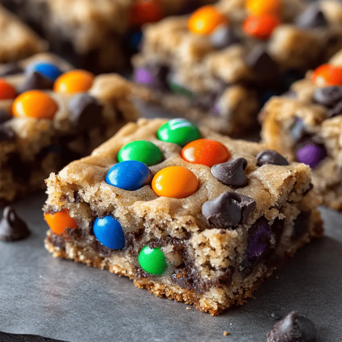 Jump to Recipe Print RecipeAs I gathered my baking supplies, a sprinkle of excitement filled the air—Halloween was just around the corner! It was time to whip up something special, and these Monster Mash Cookie Bars were the perfect choice. Loaded with gooey chocolate chips and festive Halloween candies, these bars are not only kid-friendly but also a delightful way to indulge your sweet tooth without hours of fussing in the kitchen. Best of all, they come together in just one bowl, making cleanup as easy as the prep! These bars are perfect for parties, lunchboxes, or cozy movie nights with friends. Ready to dive into this spooktacular treat? Let’s get baking! Why Are These Monster Mash Cookie Bars Perfect? Irresistible Flavor: Each bite bursts with chewy chocolate and vibrant Halloween candies, creating a festive explosion of taste that keeps everyone coming back for more! One-Bowl Wonder: You’ll love how quick and easy they are to make—no need for multiple mixing bowls or complicated steps! Kid-Friendly Fun: Whether it’s for a school function or a Halloween party, these bars are perfect for little hands to help with, making baking a memorable activity. Customizable Creations: Feel free to experiment with different candies or add a swirl of peanut butter for extra richness. These bars can be a personalized treat made just how you like! Crowd-Pleasing Delight: With their colorful appearance and delicious flavor, they are bound to be a hit with kids and adults alike—ideal for any festive gathering! Want to explore more sweet treats? Check out these delightful Sugar Cookie Truffles or decadent Chocolate Chip Cookie Dough Twists! Monster Mash Cookie Bars Ingredients For the Batter Unsalted Butter – Provides richness and moisture; can use margarine or coconut oil for a dairy-free option. Brown Sugar – Adds sweetness and a hint of molasses flavor; light brown sugar can be replaced with organic cane sugar. Granulated Sugar – Contributes additional sweetness and helps with texture. Egg – Binds the ingredients and adds moisture; for egg-free, consider a flax seed or chia egg. Vanilla Extract – Enhances the overall flavor profile. All-Purpose Flour – Forms the structure of the bars; for gluten-free, use a 1:1 gluten-free flour blend. Baking Soda – Leavening agent that helps the bars rise. Salt – Balances the sweetness. For the Goodies Chocolate Chips – Provides a rich, melty texture; dark, milk, or vegan chocolate chips can be used. Halloween M&Ms or Candy-Coated Chocolates – Adds festive flair and sweetness; substitute with any colorful chocolate candies. Candy Eyeballs – For decoration and playful appeal; can omit if unavailable. Sprinkles or Chopped Candy Bars – Optional decorative toppings for extra fun. These delightful Monster Mash Cookie Bars are the perfect Halloween treat that combines taste and fun in every bite! Step‑by‑Step Instructions for Monster Mash Cookie Bars Step 1: Preheat the Oven Start by preheating your oven to 350°F (175°C). While the oven heats up, prepare your 8×8-inch baking pan by lining it with parchment paper, allowing the edges to hang over slightly for easy removal later. This step ensures your Monster Mash Cookie Bars bake evenly and come out perfectly without sticking. Step 2: Cream the Butter and Sugars In a large mixing bowl, add the softened unsalted butter, brown sugar, and granulated sugar. Using a hand mixer or a sturdy spatula, cream the mixture together until it’s light and fluffy, which should take about 2-3 minutes. The combination of sugars adds sweetness and a rich texture that is essential for your Monster Mash Cookie Bars. Step 3: Incorporate the Egg and Vanilla Crack in one egg and pour in the vanilla extract, mixing until fully incorporated. This should only take about 1 minute; you’re looking for a smooth batter. The egg helps bind the ingredients, while the vanilla enhances the overall flavor, making your Monster Mash Cookie Bars irresistibly tasty. Step 4: Mix in the Dry Ingredients Next, sift in the all-purpose flour, baking soda, and salt. Gently stir the mixture using a spatula or wooden spoon until just combined, being careful not to overmix. This ensures your Monster Mash Cookie Bars will have the right chewy texture without becoming dense. Step 5: Fold in the Chocolate and Candies Now it’s time to fold in the chocolate chips and Halloween M&Ms, reserving a few for topping. Use a spatula to carefully mix them into the dough until evenly distributed. Once this is done, you’ll see beautiful pops of color and rich chocolate throughout your Monster Mash Cookie Bars! Step 6: Prepare for Baking Spread the cookie dough evenly into the prepared baking pan, ensuring it reaches the corners. Use the back of a spatula to gently press down. Now, take the reserved candies and candy eyeballs and press them into the top of the dough for extra flair before baking. This not only looks festive but adds delightful surprises in every bite. Step 7: Bake to Perfection Place the pan in the preheated oven and bake for 20-25 minutes. Keep an eye on the bars; they are done when the edges are golden brown and the center is set. A toothpick inserted should come out with a few moist crumbs clinging to it. This is the moment your Monster Mash Cookie Bars start to transform into a spooktacular treat! Step 8: Cool and Slice Once baked, remove the pan from the oven and let it cool completely in the pan. This will take about 30 minutes. Once cool, use the parchment paper to lift the bars out and place them on a cutting board. Slice them into squares and prepare for the delightful reactions as everyone enjoys these festive Monster Mash Cookie Bars! How to Store and Freeze Monster Mash Cookie Bars Room Temperature: Store cooled Monster Mash Cookie Bars in an airtight container for up to 3-4 days to maintain their delicious chewy texture. Freezer: For longer storage, wrap the bars individually in plastic wrap and then place th