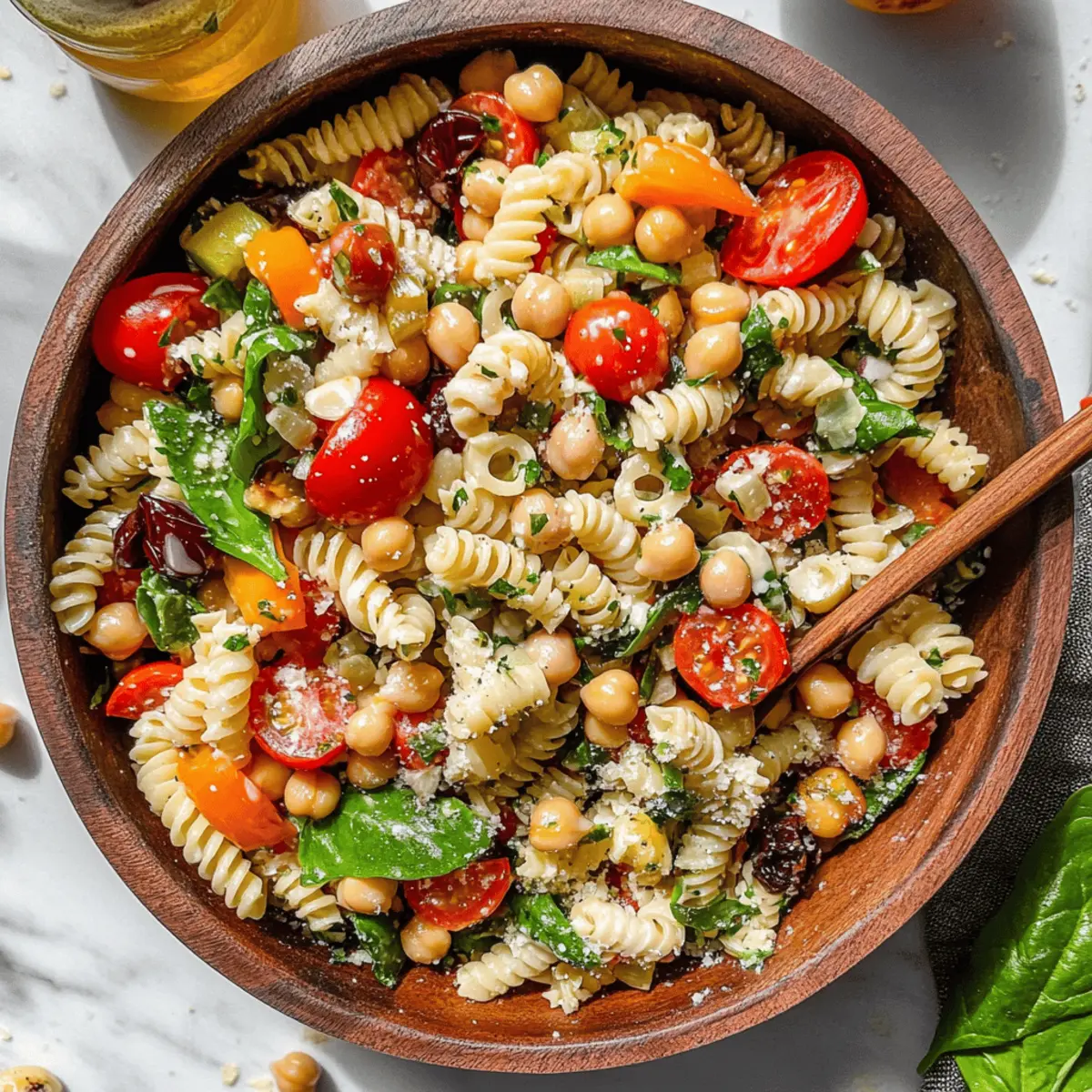 Jump to Recipe Print RecipeAs the sun begins to shine brighter and the days stretch longer, my thoughts inevitably drift toward warm-weather gatherings filled with laughter, good company, and refreshing dishes. Enter my Italian Pasta Salad with Chickpeas & Zesty Dressing—a colorful masterpiece that makes summer dining a breeze. Not only is this pasta salad make-ahead friendly, but it also offers a hearty vegetarian twist that pleases everyone at the table. Picture a medley of vibrant vegetables and protein-packed chickpeas tossed together in a zesty homemade dressing, creating a dish that’s as delightful to eat as it is to share. Perfect for picnics, barbecues, or a light dinner on a hot night, this salad is your new go-to summer delight. Are you ready to elevate your pasta salad game? Why Is This Pasta Salad So Special? Vibrant, Colorful Ingredients: The combination of fresh veggies and chickpeas creates a stunning and appetizing presentation. Make-Ahead Convenience: Prepare it the night before to save time during your busy summer gatherings. Hearty and Healthy: Packed with protein, this dish satisfies while staying light and refreshing. Versatile Dish: Customize with your favorite vegetables or proteins, making it perfect for any occasion. Crowd-Pleasing Flavor: The zesty dressing and various textures ensure that every bite is bursting with flavor! Don’t forget to try pairing this with a delicious side like my Caprese Pasta Salad or the hearty French Onion Pasta for an unforgettable meal! Pasta Salad Ingredients • Delicious mix for your Pasta Salad! Fusilli Pasta: The base of the salad, providing structure. Use any short pasta if needed. Chickpeas: Adds protein and a hearty element. Substitute with cannellini beans for a different texture. Cherry Tomatoes: Freshness and juiciness. Can replace with diced regular tomatoes for variety. Mini Sweet Peppers: Sweetness and crunch. Any bell pepper variety can be used for color. Pepperoncini Peppers: Adds a tangy kick. Omit for milder salad or substitute with diced jalapeños for heat. Kalamata Olives: Source of saltiness and depth. Green olives can be a great substitute. Parmesan Cheese: Enhances the richness and umami flavor. Use a vegan cheese alternative if dairy-free. Provolone or Mozzarella Cheese: Offers creaminess and texture. Skip for a lighter option or use a non-dairy cheese. Fresh Baby Spinach: Nutritional boost and vibrant color. Can substitute with arugula or kale for a peppery bite. Extra-Virgin Olive Oil: Key component for dressing; adds richness. Use a lighter olive oil for a different taste profile. Red Wine Vinegar: Essential for acidity in the dressing. Substitute with apple cider vinegar if desired. Pepperoncini Brine: Enhances dressing flavor. Fresh lemon juice works perfectly for a brighter taste. Shallots and Garlic: Aromatic flavor base for dressing. Onion powder can be an alternative for a milder taste. Dried Oregano & Dried Parsley: Provide herbal notes in the dressing. Fresh herbs can replace dried; just increase the quantity for freshness. Kosher Salt & Black Pepper: Basic seasoning to taste and elevate flavors. Step‑by‑Step Instructions for Italian Pasta Salad with Chickpeas & Zesty Dressing Step 1: Cook the Pasta Begin by bringing a large pot of water to a boil, adding a generous amount of salt to mimic ocean water. Once boiling, add the fusilli pasta and cook until al dente, about 8-10 minutes. Drain the pasta and rinse it under cold water to stop the cooking process and cool it down. Set it aside in a large mixing bowl. Step 2: Whisk the Dressing In a separate mixing bowl, combine 1/3 cup of extra-virgin olive oil, 3 tablespoons of red wine vinegar, and 2 tablespoons of pepperoncini brine. Add the finely minced shallots, garlic, oregano, parsley, salt, and pepper. Whisk this mixture vigorously until everything is well-blended, and let it sit for about 10 minutes to allow the flavors to meld beautifully. Step 3: Combine the Vegetables and Chickpeas In the bowl with the cooked pasta, add 1 can of drained and rinsed chickpeas, halved cherry tomatoes, diced mini sweet peppers, a handful of fresh baby spinach, sliced pepperoncini, and pitted kalamata olives. Then, sprinkle in the grated Parmesan and diced provolone or mozzarella cheese. Gently mix everything together, ensuring a colorful medley for your Italian Pasta Salad. Step 4: Dress the Salad Pour your homemade dressing over the pasta salad mixture, ensuring all ingredients are generously coated. Toss everything together with tongs or a spatula until each piece of pasta and veggies is infused with that vibrant zesty dressing. Taste and adjust the seasoning if needed, adding a pinch of salt or pepper as per your preference. Step 5: Chill and Serve Transfer the Italian Pasta Salad to a serving bowl or keep it in the mixing bowl, cover it tightly, and refrigerate for at least 1 to 2 hours. This chilling period allows the flavors to enhance and blend. When ready to serve, give the salad a good toss and enjoy the refreshing flavors at your next summer gathering. Expert Tips for Pasta Salad Flavor Boost: Let the pasta salad chill for at least 1-2 hours before serving. This allows the flavors to meld beautifully, enhancing your pasta salad experience. Proper Salting: Ensure the water is adequately salted when cooking pasta—think ‘salty as the sea.’ This step maximizes flavor and enhances the overall dish. Avoid Soggy Pasta: Rinse the pasta with cold water after cooking to stop the cooking process, ensuring it remains firm and doesn’t absorb too much dressing. Customizable Ingredients: Feel free to adjust veggies or add proteins to your pasta salad, making it personal and suited to your gathering. Storage Tips: Leftover pasta salad can be refrigerated for up to 3 days. To revive it, add a drizzle of olive oil before serving. How to Store and Freeze Pasta Salad Fridge: Keep your Italian Pasta Salad tightly covered in an airtight container for up to 3 