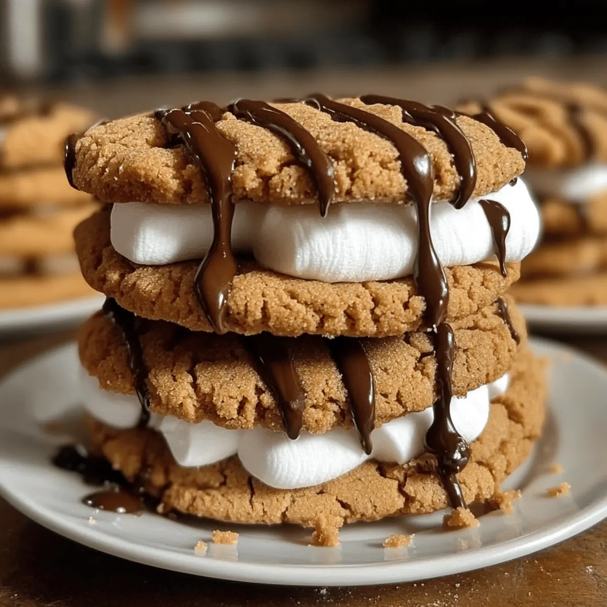 Jump to Recipe Print RecipeAs I rummaged through my pantry, a forgotten jar of creamy peanut butter caught my eye, sparking a wave of nostalgia. Instantly, I imagined biting into warm, gooey Peanut Butter S’mores Sandwich Cookies, a delightful blend of rich peanut butter, soft marshmallow fluff, and luscious chocolate. This recipe isn’t just a testament to childhood camping trips around the fire; it’s a quick and customizable treat that both kids and adults will adore. Perfect for weekend baking sessions, school lunches, or festive gatherings, these cookies sprinkle joy into any occasion. If you’re ready to whip up a batch of these delectable delights, keep reading—your taste buds are in for a delightful surprise! Why Are These Cookies So Irresistible? Nostalgic Comfort: These Peanut Butter S’mores Sandwich Cookies transport you back to carefree childhood days filled with campfire treats and laughter. Indulgent Layers: With chewy peanut butter cookies hugging gooey marshmallow fluff and rich chocolate, every bite is pure bliss. Customizable Delight: Feel free to swap in crunchy peanut butter or dark chocolate—make it your own! Quick & Easy: Ready in just under an hour, these cookies can be whipped up for a last-minute gathering or lunchbox surprise. Crowd-Pleasing Appeal: Perfect for sharing at parties or enjoying with family, they guarantee smiles and satisfied cravings. To elevate these treats, serve them alongside a warm glass of milk or check out my scrumptious Peanut Butter Cookies for an extra peanut butter fix! Peanut Butter S’mores Sandwich Cookies Ingredients For the Cookie Dough • Creamy Peanut Butter – The primary flavor and fat source; almond or cashew butter can be swapped for nut allergies. • Unsalted Butter – Adds richness and crucial structure; make sure it’s softened for ideal creaming. • Granulated Sugar – Sweetens and contributes to the cookie’s crispiness. • Light Brown Sugar – Moisture-rich with a deep caramel flavor that balances sweetness. • Large Egg – Binds everything together, adding moisture; substitute with a flax egg for a vegan option. • Vanilla Extract – Enhances the overall depth of flavor. • All-Purpose Flour – Provides essential structure; use a gluten-free blend for dietary restrictions. • Baking Powder – This leavening agent helps the cookies lift perfectly. • Kosher Salt – Balances sweetness and enhances flavors. For the Gooey Filling • Marshmallow Fluff – The star of the filling, delivering delightful gooeyness. • Creamy Peanut Butter (for filling) – Adds richness to the marshmallow fluff filling. • Milk Chocolate Chips – Offers a rich chocolate flavor; swap for dark chocolate for a more intense taste. The delightful combination of flavors in these Peanut Butter S’mores Sandwich Cookies is sure to satisfy any sweet tooth! Step‑by‑Step Instructions for Peanut Butter S’mores Sandwich Cookies Step 1: Preheat the Oven Preheat your oven to 350°F (175°C). While it warms up, line a baking sheet with parchment paper to prevent the cookies from sticking. This will ensure that your Peanut Butter S’mores Sandwich Cookies bake evenly and achieve that delightful golden edge everyone loves. Step 2: Cream the Butters and Sugars In a large mixing bowl, use an electric mixer to beat together ½ cup of creamy peanut butter, ½ cup of softened unsalted butter, ½ cup of granulated sugar, and ½ cup of light brown sugar. Mix on medium speed for about 2-3 minutes until the mixture is light and fluffy. This step is crucial for incorporating air, which makes your cookies tender and airy. Step 3: Add Egg and Vanilla Once the mixture is creamy, add 1 large egg and 1 teaspoon of vanilla extract. Continue to mix on medium speed until everything is well combined, about 1-2 minutes. The egg helps bind the ingredients together, making your Peanut Butter S’mores Sandwich Cookies perfectly soft and chewy. Step 4: Combine Dry Ingredients In a separate bowl, whisk together 1 ½ cups of all-purpose flour, 1 teaspoon of baking powder, and ½ teaspoon of kosher salt. Gradually add this dry mixture to the wet ingredients, stirring with a rubber spatula until a soft dough forms. Take care not to overmix; you want a tender cookie dough for the best texture. Step 5: Shape the Cookies Use a tablespoon to scoop out the dough and roll it into balls. Place the balls on the prepared baking sheet, spacing them about 2 inches apart. Flatten each ball gently with a fork to create a distinctive crisscross pattern. This not only looks pretty but also helps the cookies bake evenly. Step 6: Bake and Cool Bake the cookies in the preheated oven for 10-12 minutes, or until the edges are golden brown while the centers appear slightly soft. Once baked, allow them to cool on the baking sheet for about 5 minutes before transferring to a wire rack. This resting time helps them set up perfectly. Step 7: Prepare the Gooey Filling While the cookies are cooling, melt 1 cup of milk chocolate chips in a microwave-safe bowl. Heat them in 20-second intervals, stirring after each, until the chocolate is completely smooth and pourable. This melted chocolate will be drizzled as part of your filling, bringing that rich flavor to the Peanut Butter S’mores Sandwich Cookies. Step 8: Assemble the Cookies On the bottom of one cooled cookie, spread a layer of marshmallow fluff followed by a layer of creamy peanut butter. Drizzle some of the melted chocolate on top, allowing it to cascade down, adding a deliciously rich layer to the filling. Top with another cookie, gently pressing down to create a sandwich. Step 9: Let Them Set To finish your Peanut Butter S’mores Sandwich Cookies, let them set at room temperature for 10-15 minutes. Alternatively, you can chill them in the refrigerator for about 10 minutes to firm up the filling before serving. This will enhance the gooey texture and flavor of these delightful treats. Expert Tips for Peanut Bu