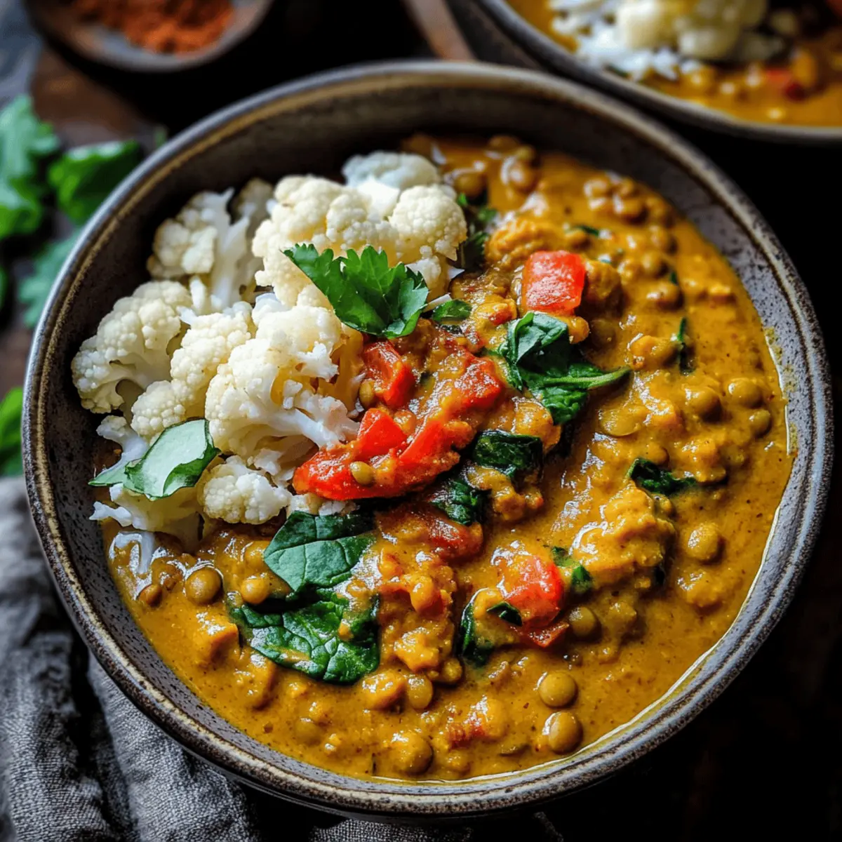 Jump to Recipe Print RecipeThe aroma of warm spices wafting through the kitchen instantly transports me back to comforting dinners shared with family. Today, I’m excited to share my Creamy Cauliflower and Lentil Curry, a delightful vegan dish that’s not only easy to prepare but also a true crowd-pleaser for both plant-based foodies and meat lovers alike. Imagine a pot bubbling with tender cauliflower and hearty lentils, all enveloped in a creamy coconut sauce that’s simply irresistible. Perfect for busy weeknights, this dish utilizes pantry staples and leftover veggies, ensuring no waste and plenty of flavor. As the cozy meal simmers, it transforms into a nourishing feast, brimming with nutrients. Ready to dive into a warming bowl of goodness that feeds both body and soul? Let’s get cooking! Why Is This Curry a Game-Changer? Creamy, this curry is like a warm hug in a bowl, making it perfect for chilly evenings. Quick to prepare, it takes minimal effort while delivering maximum flavor, thanks to pantry staples. Versatile, you can easily swap lentils for chickpeas or toss in any extra veggies lying around. Nutrient-dense, it’s packed with protein and fiber, making it a wholesome meal choice. Plus, the inviting aroma will have everyone gathering around the table, eager for a taste of your delicious creation! Enjoy it with rice, naan, or even over quinoa for a delightful twist. Roasted Cauliflower Lentil Curry Ingredients For the Curry Base Cauliflower – Provides bulk and texture; roasting enhances its delightful flavor. Canned Diced Tomatoes – Forms the curry base and adds acidity; fresh tomatoes can be used but may require longer cooking. Coconut Milk – Adds creaminess and richness; substitute with almond milk or cashew cream for a different flavor. For the Seasoning Vegetable Oil – Used for roasting; any mild oil can be substituted. Onion – Adds natural sweetness; shallots or leeks work well as alternatives. Garlic – Enhances depth of flavor; can use garlic powder or more shallots if needed. Curry Powder – Provides the signature flavor of this roasted cauliflower lentil curry; opt for your preferred blend or adjust spices to taste. Garam Masala – Adds warmth and complexity; if unavailable, try a mix of cumin and coriander. Ground Turmeric, Cumin, Coriander, and Cinnamon – Contributes fragrant spices to enhance the dish; adjust these to your flavor preference. Salt – Elevates overall flavor; feel free to modify based on personal taste. For the Protein and Greens Cooked Brown Lentils – A hearty source of protein and texture; substitute with cooked chickpeas or red lentils if desired. Fresh Spinach – Adds a nutrient boost and vibrant color; kale or Swiss chard can be great alternatives. With all these delicious ingredients at your fingertips, you’re just moments away from whisking up a wholesome and delightful meal that brings comfort to your dinner table! Step‑by‑Step Instructions for Roasted Cauliflower Lentil Curry Step 1: Preheat and Prepare Begin by preheating your oven to 410°F (210°C) while you prepare a baking tray lined with parchment paper. This will ensure your cauliflower roasts evenly, developing a beautiful golden color and rich flavor. Rinse and chop the cauliflower into bite-sized florets, ready to be enhanced with spices. Step 2: Season the Cauliflower In a large bowl, toss the cauliflower pieces with vegetable oil, curry powder, and a pinch of salt, ensuring each piece is fully coated for optimal roasting. Spread the seasoned cauliflower evenly on the baking tray and pop it in the oven for 40-45 minutes. Flip the florets halfway through, allowing them to caramelize and reach that perfect golden-brown hue. Step 3: Cook the Rice While the cauliflower is roasting, cook your rice according to the package instructions. This step is crucial as the fluffy rice will serve as a delightful base for your creamy roasted cauliflower lentil curry. Keep it warm and set aside once cooked, ensuring it’s ready to complement your hearty curry. Step 4: Sauté the Onion In a large pot, heat a drizzle of vegetable oil over medium-high heat. Add diced onions and sauté for about 5-7 minutes until they turn golden and fragrant. If the onions stick to the pot, add a splash of water to deglaze and prevent burning, enhancing the dish’s overall flavor. Step 5: Add Garlic and Spices Next, add the crushed garlic to the pot and stir continuously for 30-60 seconds, allowing it to become fragrant. Toss in additional spices, like ground turmeric and cumin, and continue stirring to toast them gently. This step infuses your creamy roasted cauliflower lentil curry with warmth and depth. Step 6: Create the Curry Base Incorporate the canned diced tomatoes into the pot, stirring to combine, and let it simmer for 5 minutes. This simmering allows the acidity of the tomatoes to meld with the aromatic base you’ve created, forming a rich foundation for your curry. Step 7: Combine with Coconut Milk and Lentils Stir in the coconut milk along with the cooked brown lentils and the roasted cauliflower that’s been turning golden in the oven. Bring the mixture to a gentle heat for about 5 minutes, stirring occasionally. This melding allows the flavors to marry beautifully, creating a creamy and satisfying consistency. Step 8: Add Fresh Spinach As the curry heats through, gently fold in the fresh spinach until it wilts, adding vibrant color and nutrients to your dish. The bright greens elevate both the presentation and healthiness of your creamy roasted cauliflower lentil curry, making it truly nourishing. Step 9: Serve and Enjoy Now it’s time to serve your hearty curry! Ladle it generously over the fluffy rice or alongside warm naan. The inviting aroma and comforting flavors are sure to make this creamy roasted cauliflower lentil curry a family favorite! Expert Tips for Roasted Cauliflower Lentil Curry Roasting Essential: Don’t skip roasting the cauliflower! This step dee