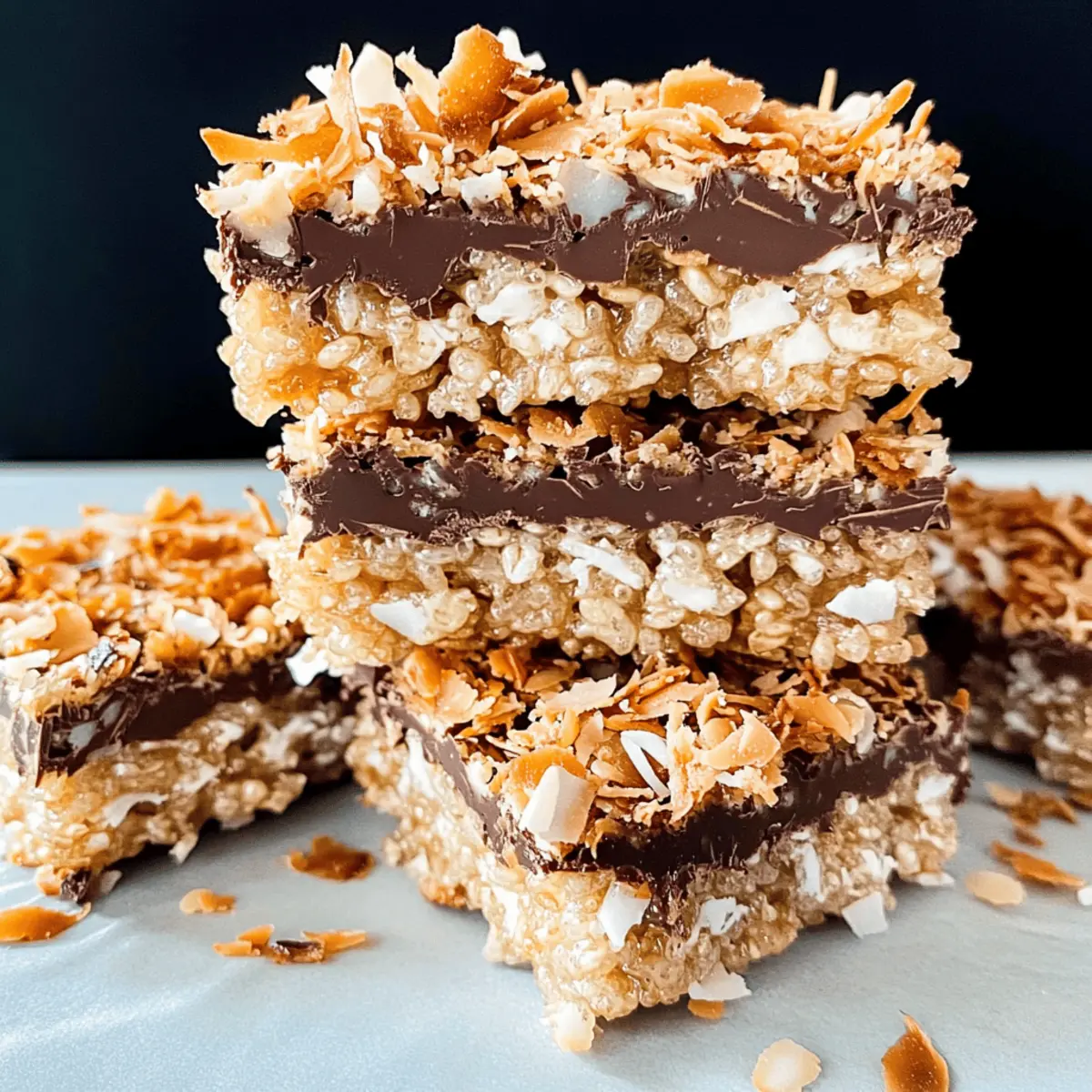 Jump to Recipe Print RecipeAs I stood in the kitchen, the warm, toasty scent of coconut wafted through the air, instantly transforming my home into a nostalgic haven. These Samoa Rice Krispie Treats capture that beloved flavor profile of the classic Girl Scout Samoa cookie, blending gooey marshmallows and crunchy Rice Krispies into a delightful no-bake dessert. With just a handful of simple ingredients, this treat offers a quick prep time, making it an accessible indulgence for any gathering or cozy night in. Topped with rich chocolate and a sprinkle of coconut, these bars are not just a feast for the palate but a heartwarming reminder of those cherished childhood moments. Ready to relive some sweetness? Let’s dive into the details of crafting these irresistible treats! Why are Samoa Rice Krispies a Must-Try? Nostalgic Flavor: Relive childhood memories with the iconic taste of Girl Scout Samoa cookies fused into a chewy dessert bar. No-Bake Simplicity: Quick and easy, these treats require minimal effort for maximum satisfaction—perfect for busy weeknights! Crowd-Pleasing Treat: Ideal for parties, potlucks, or family gatherings, they are sure to impress your guests and keep them coming back for more. Versatile Options: Customize with dark chocolate or mix in your favorite nuts for a personal twist. Want another delicious treat? Try making Homemade Samoas Cookies, too! Quick Prep: With just a few ingredients, you’ll have these delectable bars ready in no time, making them a fabulous choice for spontaneous dessert cravings. Samoa Rice Krispie Treats Ingredients • Let’s gather what you need for these delicious no-bake treats! For the Base Mini Marshmallows – 5 cups; essential for a chewy texture. Use Jet Puffed for the best results. Butter – 3 tablespoons; adds richness and helps bind the marshmallows and cereal. Rice Krispie Cereal – 6 cups; the core ingredient providing that delightful crunch. Any brand will do! For the Samoa Flavor Sweetened Shredded Coconut – 14 oz bag; adds texture and flavor reminiscent of Girl Scout Samoa cookies. Toast for an extra depth of flavor. Dulce de Leche – 13.4 oz can; delivers a creamy caramel layer—don’t substitute with sweetened condensed milk. Milk – 2 tablespoons; thins the dulce de leche, making it easy to mix. For the Topping Semi-Sweet Chocolate – 6 oz; melted, this creates a rich layer on top. Feel free to swap it for dark chocolate for a bolder flavor. Now that you have all the ingredients ready, you’re one step closer to savoring these Samoa Rice Krispie Treats! 🍫🥥 Step‑by‑Step Instructions for Samoa Rice Krispies Step 1: Toast Coconut In a sauté pan over medium-high heat, add the entire bag of sweetened shredded coconut. Stir constantly for about 5–7 minutes, or until the coconut is golden brown and fragrant. Once toasted, remove from heat and set aside ½ cup for topping, ensuring that the remaining coconut is ready for mixing into your Samoa Rice Krispie Treats. Step 2: Prepare Dulce de Leche In a microwave-safe bowl, combine the dulce de leche with 2 tablespoons of milk. Microwave the mixture for 1.5 minutes, stirring halfway through until it’s smooth and slightly thinned. This will make it easier to mix with the toasted coconut later, creating a delicious caramel layer that enhances your Samoa Rice Krispies. Step 3: Melt Marshmallows and Butter In a large microwavable bowl, combine 5 cups of mini marshmallows and 3 tablespoons of butter. Microwave these together for about 1–2 minutes, pausing to stir until the marshmallows are fully melted and blended into a smooth, gooey mixture. This step gives your Samoa Rice Krispies that sticky, delightful texture. Step 4: Combine with Cereal Carefully fold in 6 cups of Rice Krispie cereal into the melted marshmallow mixture. Use a spatula to ensure every piece of cereal is evenly coated, which takes about 1–2 minutes. This step is crucial for achieving the right balance of chewy and crunchy in your Samoa Rice Krispies. Step 5: Layering Grease an 8×12 inch pan with cooking spray for easy removal later. Press half of the cereal mixture firmly into the bottom of the pan, ensuring it’s compact. Next, spread the prepared dulce de leche and toasted coconut mixture over this layer, and then top it with the remaining cereal mixture, pressing down firmly to create an even layer. Step 6: Finishing Touch In a microwave-safe bowl, melt 6 oz of semi-sweet chocolate for about 1 minute, stirring until smooth. Drizzle the melted chocolate over the top layer of your Samoa Rice Krispies, using a spatula to spread it evenly. Immediately sprinkle the reserved toasted coconut on top before the chocolate sets, adding that final touch of flavor. Samoa Rice Krispies Variations Feel free to let your creativity shine with these delightful variations on your Samoa Rice Krispie Treats! Dark Chocolate: Replace semi-sweet chocolate with dark chocolate for a richer, more intense flavor. The deep cocoa notes elevate the overall treat beautifully. Nutty Crunch: Add 1 cup of chopped nuts, such as pecans or walnuts, to the cereal mixture for an unexpected crunch that complements the Samoa flavor wonderfully. The mix of textures adds a delightful surprise in every bite! Caramel Swirl: Drizzle extra caramel sauce over the top before adding the chocolate for an extra layer of indulgence. This sweet touch amplifies the caramel essence, making each bite even more delectable. Palate Cleanser: Consider adding a pinch of sea salt or a sprinkle of flaked sea salt on top once the chocolate is set. The salt accentuates the sweetness and creates a delightful contrast. Toasted Coconut Swap: For an even deeper coconut flavor, mix in a bit more toasted coconut to the marshmallow mixture or on top. This boosts the tropical essence of your treats, making them extra special. Flavor Extracts: Incorporate a teaspoon of pure vanilla or almond extract into the marshmallow and butter mixture for an aromatic t